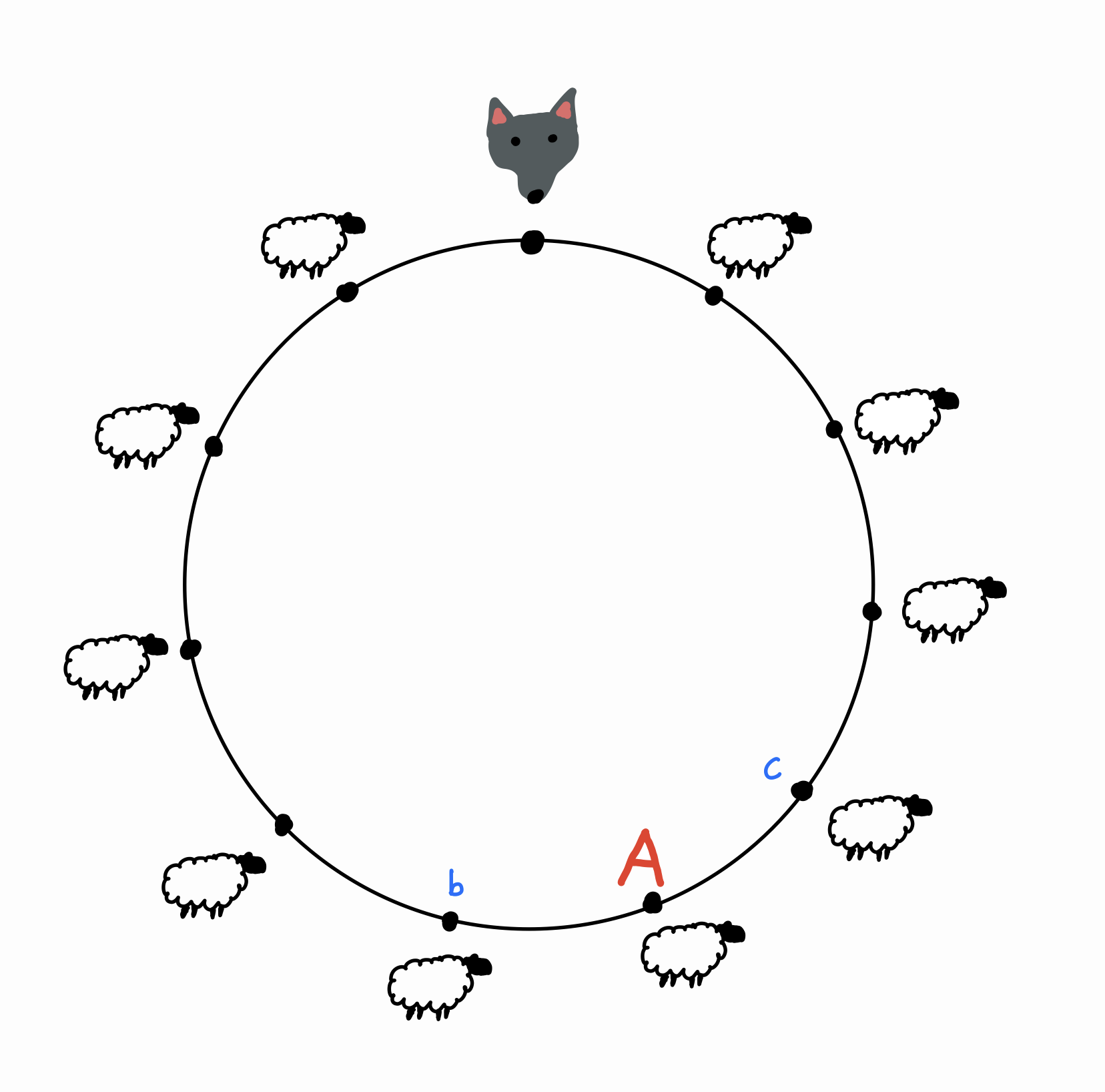 Here’s a slick way to answer this question. Without loss of generality, say that the wolf visits point \(b\) before point \(c\) (the other case is handled symmetrically). Let this be the first time that the wolf is next to \(A\). Then in order for \(A\) to be the last point visited, the wolf must make it all the way around the circle clockwise to point \(c\) before it reaches \(A\). In other words, the probability that \(A\) is the last sheep eaten is the same as the probability that the wolf reaches a point \(9\) positions clockwise before a point \(1\) position counterclockwise. Let’s call this probability \(x\).