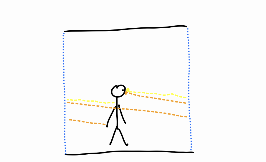 Because of this, you find yourself trapped inside the box. Any time you try to leave through the front or the back, you just reappear on the other side. You can even stick half of your body through the portal at a time. You won’t even feel anything unusual about your body being split into two discontiguous parts because all of the blood flow and nerve signals pass will freely between the portals.1 If your arms are long enough, you can even reach forward and tap the back of your head, or high-five yourself by spreading out your arms.