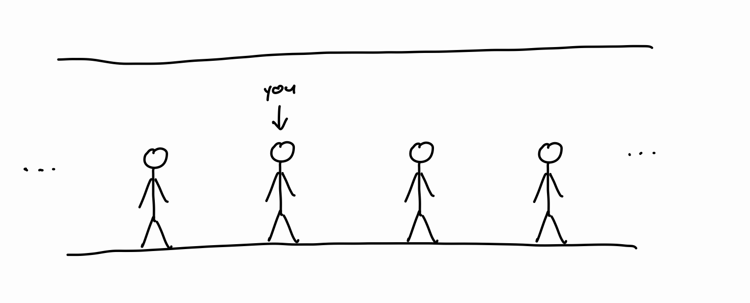 For the purposes of this thought experiment, let’s assume the universe is deterministic. The state of the universe at time \(t+1\) is completely determined by the state of the universe at time \(t\). We’ll just ignore weird quantum randomness and problems with free will for now 3. Since your actions are determined by your brain state, which in turn is controlled by physical laws that affect all of your clones’ brains identically, your clones will all act in the exact same way as you. Every time you have the urge to wave your left hand, all infinity of your clones will feel the same urge to wave their left hands. If you open your mouth and shout out “you guys move left, I’ll move right,” all of them will simultaneously shout the same thing. Even if you take a coin out of your pocket and flip it, the exact muscle twitches you use to toss the coin will be the same for all of your clones, so you will all get the same result. No matter how hard you try, you will never be able to break the fundamental periodicity of your universe.
